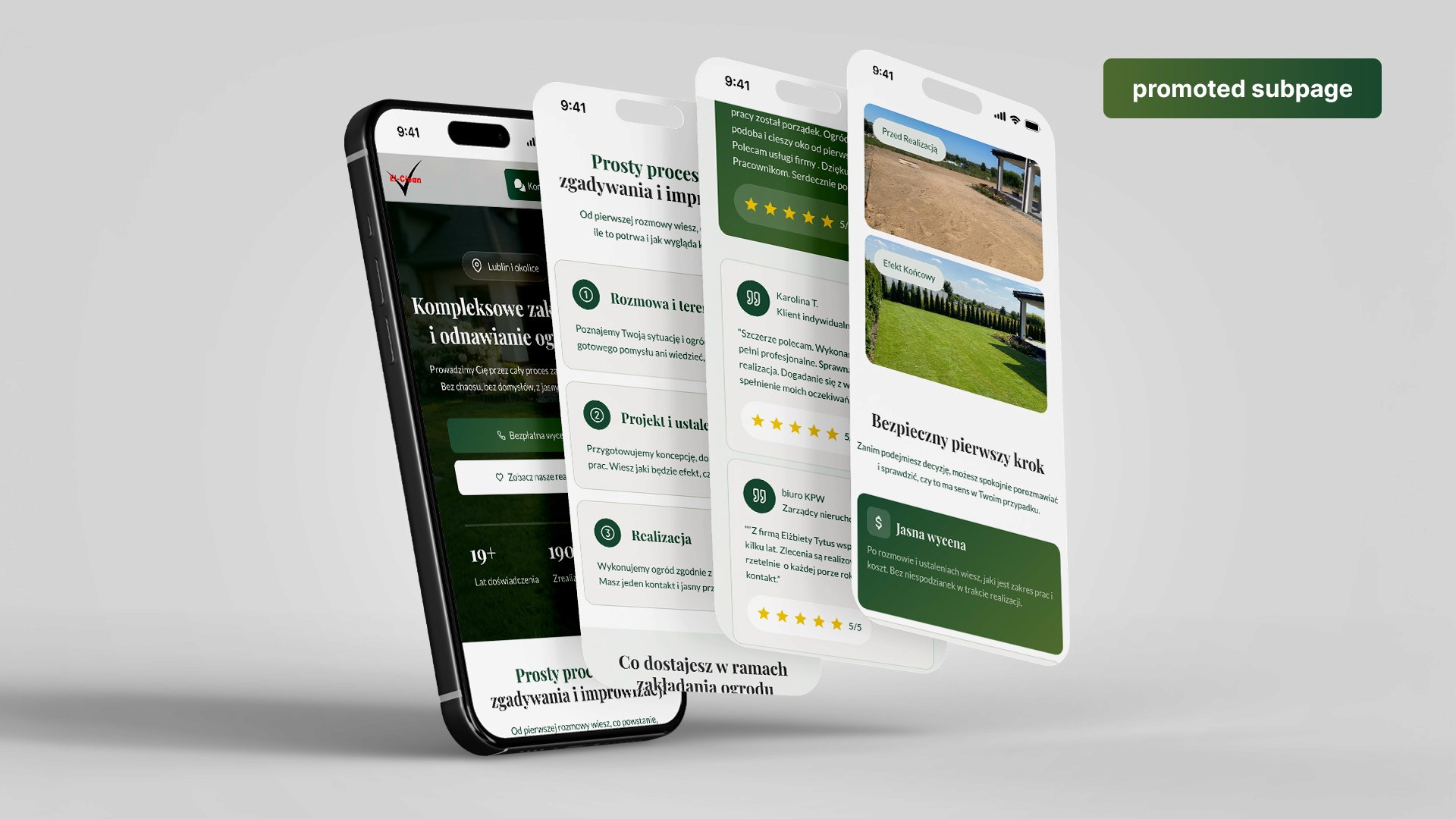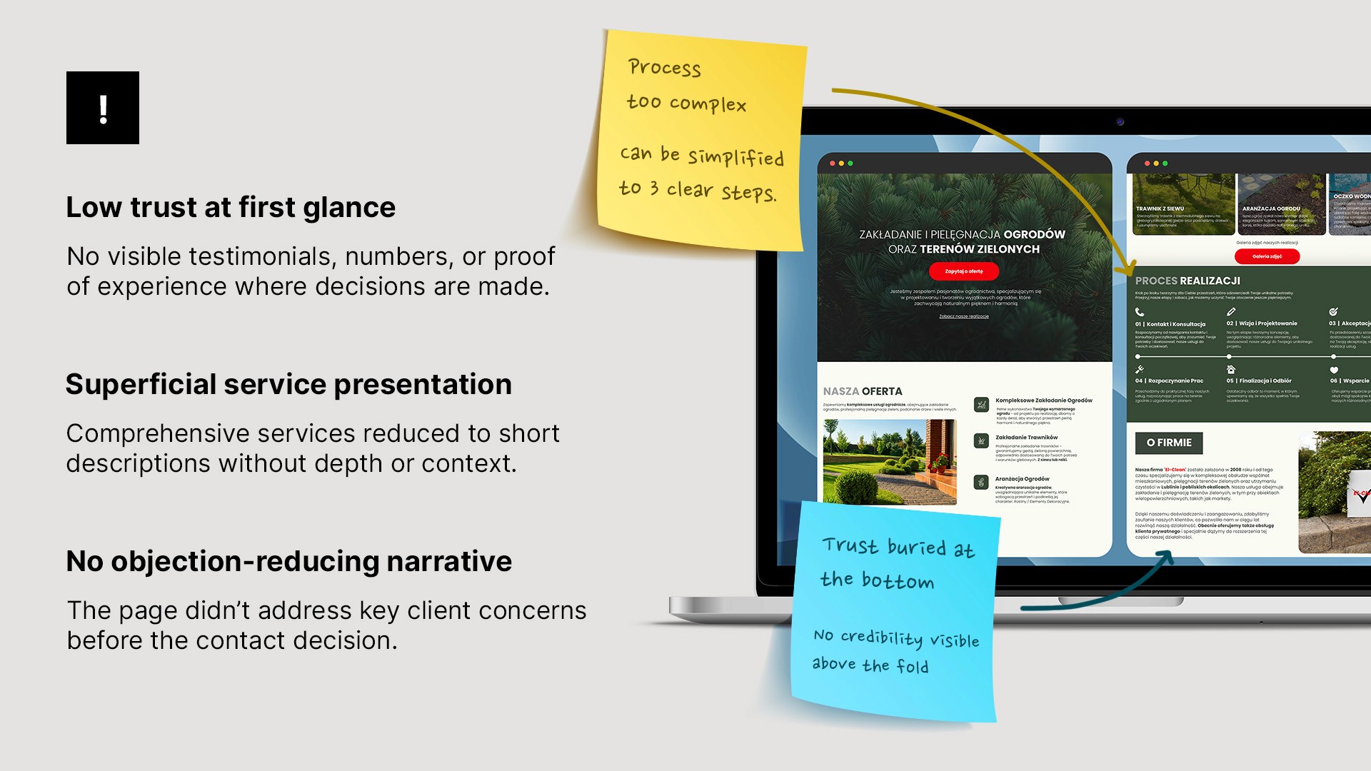 The scope of the project included redesigning a full-scale website (not a one-page layout), restructuring the service offering, and adapting the communication to a new target audience - private clients interested in comprehensive garden design and installation.